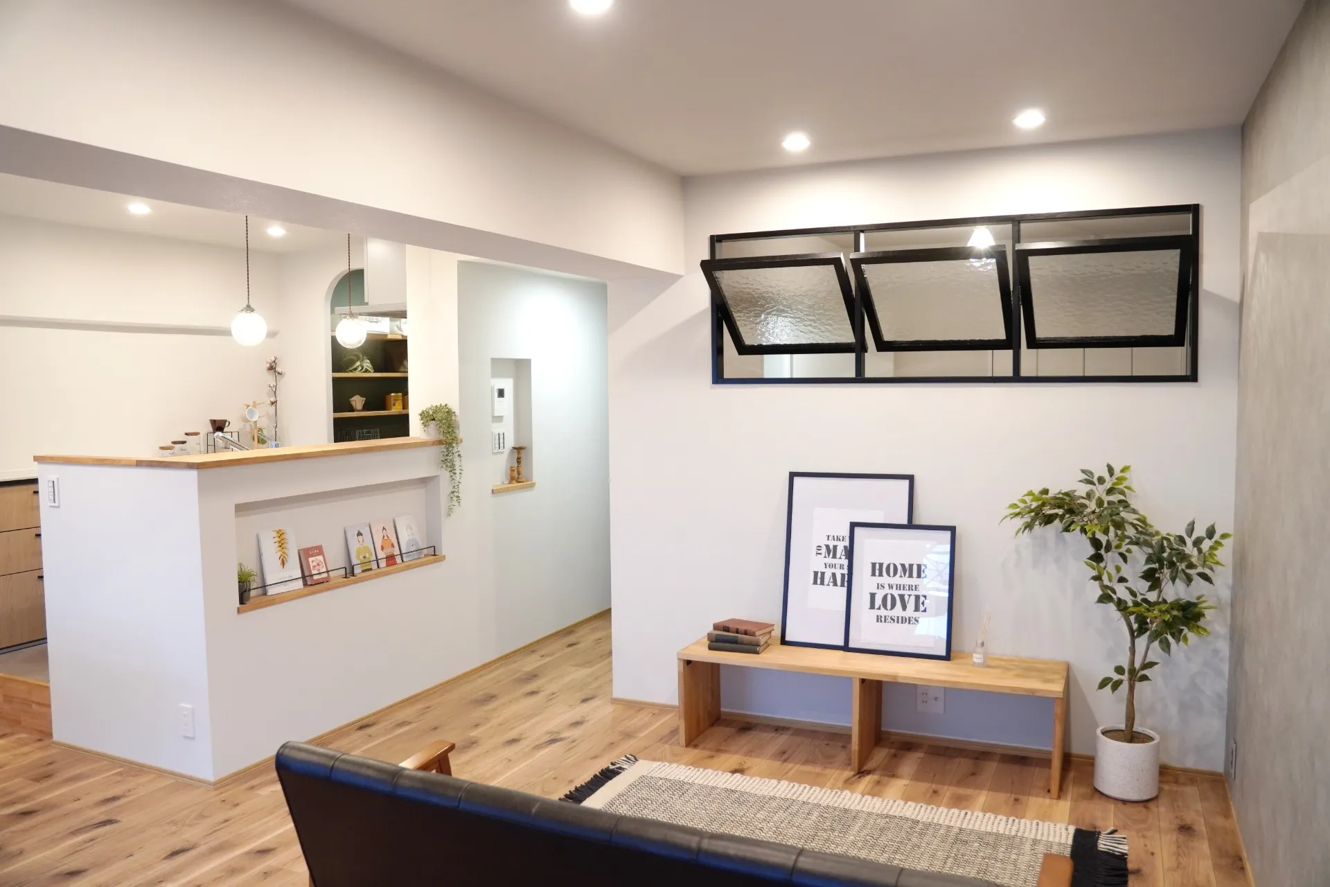 大阪府守口市 メリハリのあるナチュラルな家 ナチュラルなあたたかみをベースに、ブラックでメリハリを効かせたおうち。細長かったLDKは和室をなくして広げ、キッチン横にはパントリーを新設。リビングに設けた大きな室内窓は、エアコンを設置できな…