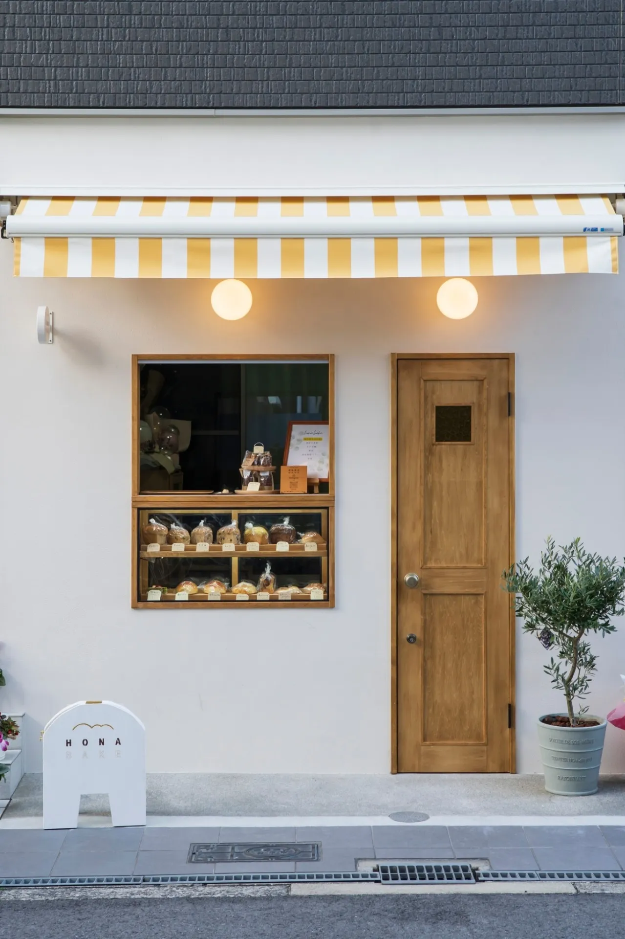 大阪市旭区 ミニ食パンのお店 大阪市旭区のミニ食パンのお店。厨房のみを備えたコンパクトなつくりで、商品はショーケースカウンターから注文するスタイル。オーニングテントは、オーナー様の雰囲気にぴったりなマリーゴールド色のス…